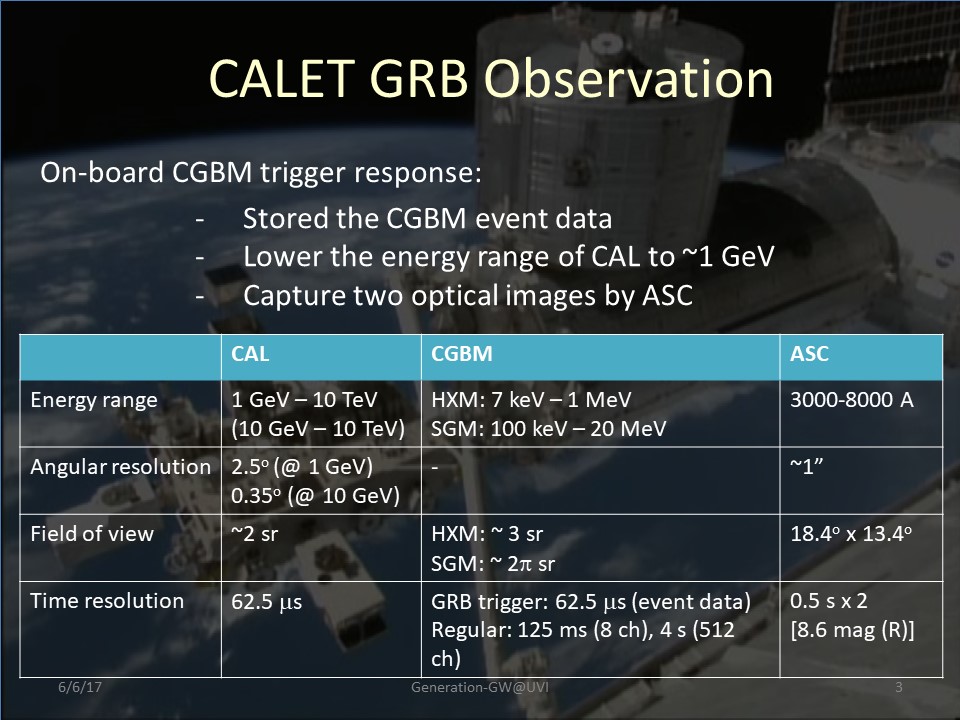CALET, an acronym for CALorimetric Electron Telescope, is a Japanese-Italian-US mission developed as part of the utilization plan for the International Space Station (ISS). CALET was launched Aug. 19, 2015 on an H2 rocket utilizing the Japanese-developed HTV (H-IIA Transfer Vehicle) and robotically attached to the Exposure Facility attached to the Japanese Experiment Module (JEM-EF) (Figure 1).
