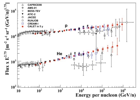 Figure 1. The proton and helium spectra measured by various instruments, with the expected CALET results after 5 years.